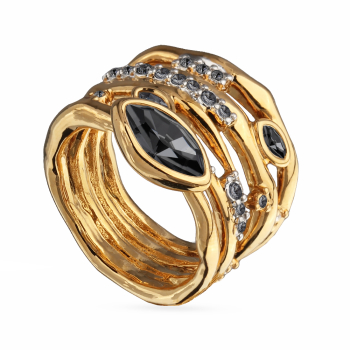 Изготовлено из ювелирного сплава на основе латуни с гальваническим покрытием золотом и родием. Изделие украшают кристаллы SW темно-серого цвета. Ширина кольца 2.1см.