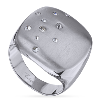 Изготовлено из ювелирного сплава на основе латуни с гальваническим покрытием сатиновым родием. Изделие украшают кристаллы SW белого цвета. Ширина кольца 2см.