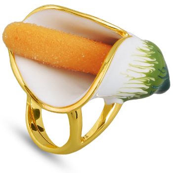 Изготовлено из ювелирного сплава на основе латуни с гальваническим покрытием золотом. Изделие украшает эмаль зеленого, белого и желтого цвета, нанесенная вручную. Размер украшения 4х2.5см.