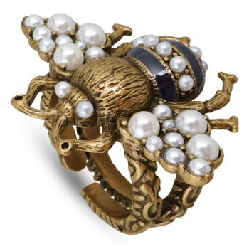 Изготовлено из ювелирного сплава на основе латуни с гальваническим покрытием античным золотом. Изделие украшают жемчуг Майорка белого цвета и черная эмаль. Размер украшения 4х3см.