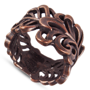 Изготовлено из ювелирного сплава на основе латуни с гальваническим покрытием медью. Ширина кольца 1.5см.