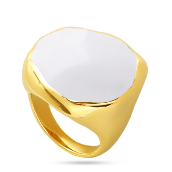 Изготовлено из ювелирного сплава на основе латуни с гальваническим покрытием золотом. Изделие украшает эмаль белого цвета. Ширина кольца 2, 5см.