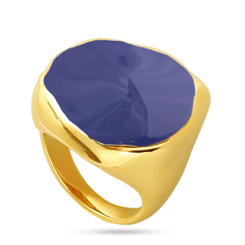 Изготовлено из ювелирного сплава на основе латуни с гальваническим покрытием золотом. Изделие украшает эмаль фиолетового цвета. Ширина кольца 2, 5см.