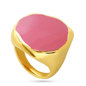 Изготовлено из ювелирного сплава на основе латуни с гальваническим покрытием золотом. Изделие украшает эмаль цвета фуксия. Ширина кольца 2, 5см.
