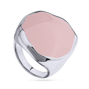 Изготовлено из ювелирного сплава на основе латуни с гальваническим покрытием родием. Изделие украшает эмаль розового цвета. Ширина кольца 2, 5см.