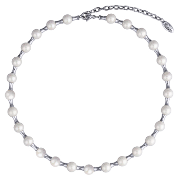 Изготовлено из ювелирного сплава на основе латуни с гальваническим покрытием родием. Изделие украшает майорский круглый жемчуг белого цвета диаметром 8мм. Длина колье 40см. Замок-карабин с удлинителем 7см.