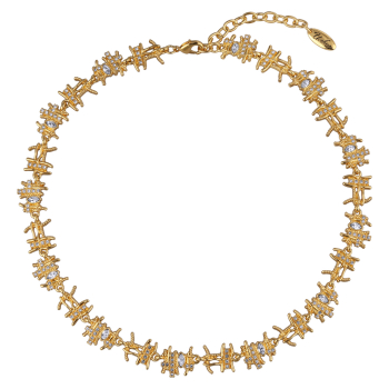 Изготовлено из ювелирного сплава на основе латуни с гальваническим покрытием золотом. Изделие украшают кристаллы SW белого цвета. Длина колье 39см. Замок-карабин с удлинителем 5см.