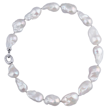 Изготовлено из ювелирного сплава на основе латуни с гальваническим покрытием родием. Колье выполнено из натурального белого барочного жемчуга диаметром 15-25мм ифианиты белого цвета. Длина 45см.*Цвет и форма жемчужин может отличаться от изображенной на фо