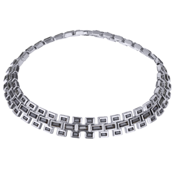 Изготовлено из ювелирного сплава на основе латуни с гальваническим покрытием родием. Изделие украшают кристаллы SW темно-серого цвета. Длина 38-41см. Ширина 1, 5см.