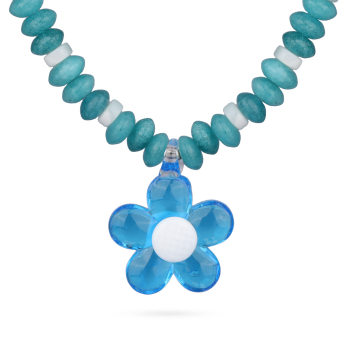 Изготовлено из ювелирного сплава на основе латуни с гальваническим покрытием родием. Изделие украшает кварц изумрудного цвета и муранское стекло в виде цветка синего цвета. Размер украшения 2.2х2.2см. Длина 42см. Замок-карабин с удлинителем 6см.