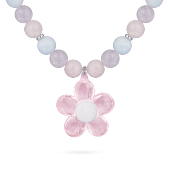 Изготовлено из ювелирного сплава на основе латуни с гальваническим покрытием родием. Изделие украшает морганит цвета карамельный микс 8мм и муранское стекло в виде цветка розового цвета. Размер украшения 2.2х2.2см. Длина 42см. Замок-карабин с удлинителем