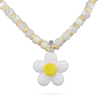 Изготовлено из ювелирного сплава на основе латуни с гальваническим покрытием золотом. Изделие украшает перламутр и муранское стекло в виде цветка белого цвета. Размер украшения 2.2х2.2см. Длина 42см. Замок-карабин с удлинителем 6см.