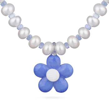 Изготовлено из ювелирного сплава на основе латуни с гальваническим покрытием родием. Изделие украшает белый жемчуг и муранское стекло в виде цветка синего цвета. Размер украшения 2.2х2.2см. Длина 42см. Замок-карабин с удлинителем 6см.
