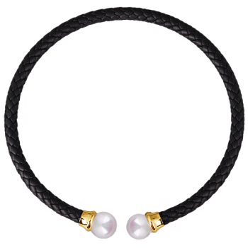 Изготовлено из ювелирного сплава на основе латуни с гальваническим покрытием золотом. Изделие украшают жемчуг Майорка белого цвета диаметром 16мм и черная натуральная кожа.