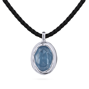 Изготовлено из ювелирного сплава на основе латуни с гальваническим покрытием родием. Изделие украшают кристаллы SW цвета байкальский лед. Длина черного кожаного шнурка 38см. Удлинитель 7см. Размер кулона 1.7х1.4см.