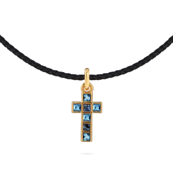 Изготовлено из ювелирного сплава на основе латуни с гальваническим покрытием золотом. Изделие украшают кристаллы SW цвета джинс и аквамарин. Длина черного кожаного шнурка 38см. Замок-карабин с удлинителем 7см. Размер кулона 3х1.5см.