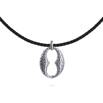 Изготовлено из ювелирного сплава на основе латуни с гальваническим покрытием родием. Длина черного кожаного шнурка 40см. Замок-карабин с удлинителем 7см. Размер кулона 3.5х3см.