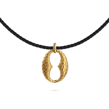 Изготовлено из ювелирного сплава на основе латуни с гальваническим покрытием золотом. Длина черного кожаного шнурка 40см. Замок-карабин с удлинителем 7см. Размер кулона 3.5х3см.