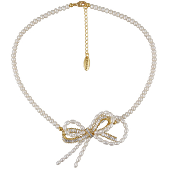 Изготовлено из ювелирного сплава на основе латуни с гальваническим покрытием золотом. Колье выполнено из натурального белого жемчуга диаметром 5мм. Длина 38-43см. *Цвет и форма жемчужин может отличаться от изображенной на фото.