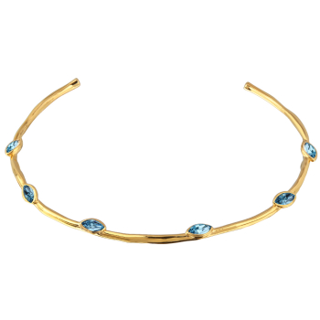 Изготовлено из ювелирного сплава на основе латуни с гальваническим покрытием золотом. Изделие украшают кристаллы SW цвета аквамарин. Длина колье 37см.
