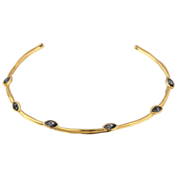 Изготовлено из ювелирного сплава на основе латуни с гальваническим покрытием золотом. Изделие украшают кристаллы SW темно-серого цвета. Длина колье 37см.