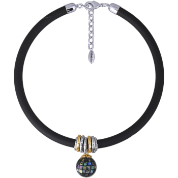 Изготовлено из ювелирного сплава на основе латуни с гальваническим покрытием родием и золотом. Изделие украшает гелиотис диаметром 18мм. Длина черного каучукового шнурка 40см, диаметр 8мм. Замок-карабин с удлинителем 6см.