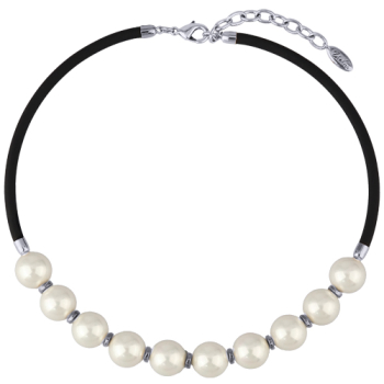 Изготовлено из ювелирного сплава на основе латуни с гальваническим покрытием родием. Изделие украшает жемчуг Майорка диаметром 14мм белого цвета. Длина черного каучукового шнурка 45см. Замок-карабин с удлинителем 5см.
