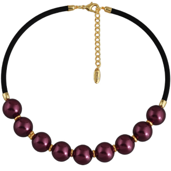 Изготовлено из ювелирного сплава на основе латуни с гальваническим покрытием золотом. Изделие украшает жемчуг Майорка диаметром 16мм цвета бургунди. Длина черного каучукового шнурка 45см. Замок-карабин с удлинителем 5см.
