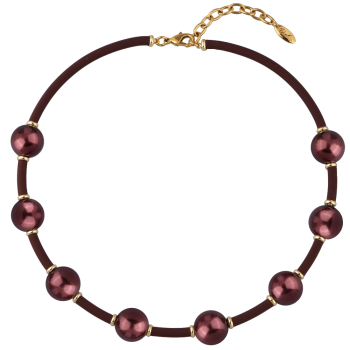 Изготовлено из ювелирного сплава на основе латуни с гальваническим покрытием золотом. Изделие украшает жемчуг Майорка диаметром 16мм цвета бургунди . Длина шоколадного каучукового шнурка 42см. Замок-карабин с удлинителем 5см.