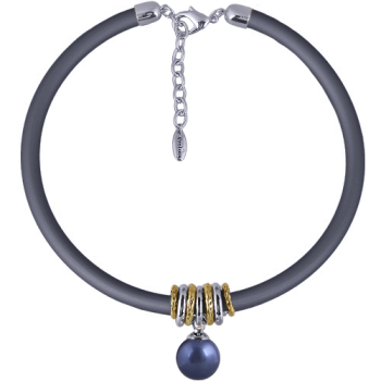 Изготовлено из ювелирного сплава на основе латуни с гальваническим покрытием родием и золотом. Изделие украшает круглый жемчуг Майорка черничного цвета диаметром 16мм. Длина графитового каучукового шнурка 40см, диаметр 8мм. Замок-карабин с удлинителем 5см