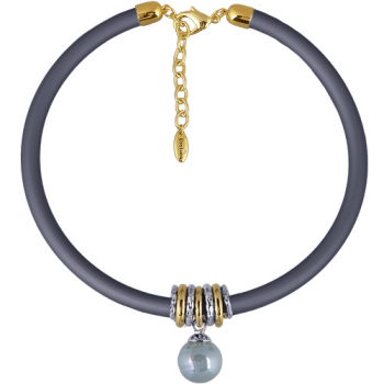 Изготовлено из ювелирного сплава на основе латуни с гальваническим покрытием золотом и родием. Изделие украшает круглый жемчуг Майорка голубого цвета диаметром 16мм. Длина графитового каучукового шнурка 40см, диаметр 8мм. Замок-карабин с удлинителем 5см.