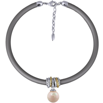 Изготовлено из ювелирного сплава на основе латуни с гальваническим покрытием родием и золотом. Изделие украшает круглый жемчуг Майорка нежно-персикового цвета диаметром 16мм. Длина серого каучукового шнурка 19см, диаметр 8мм. Замок-карабин с удлинителем 3