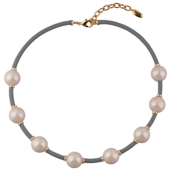 Изготовлено из ювелирного сплава на основе латуни с гальваническим покрытием золотом. Изделие украшает жемчуг Майорка диаметром 16мм розового цвета. Длина серого шнурка 42см. Замок-карабин с удлинителем 5см.