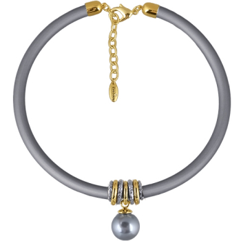 Изготовлено из ювелирного сплава на основе латуни с гальваническим покрытием золотом и родием. Изделие украшает круглый жемчуг Майорка серо-голубого цвета диаметром 16мм. Длина серого каучукового шнурка 40см, диаметр 8мм. Замок-карабин с удлинителем 5см.