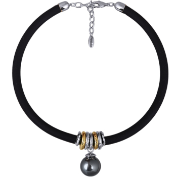 Изготовлено из ювелирного сплава на основе латуни с гальваническим покрытием родием и золотом. Изделие украшает круглый жемчуг Майорка темно-серого цвета диаметром 18мм. Длина черного каучукового шнурка 40см, диаметр 8мм. Замок-карабин с удлинителем 6см.