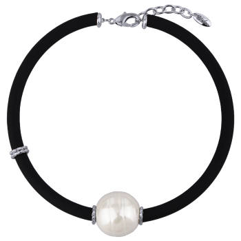 Изготовлено из ювелирного сплава на основе латуни с гальваническим покрытием родием. Изделие украшает белый жемчуг Майорка диаметром 30мм. Длина черного каучукового шнурка 45см. Замок-карабин с удлинителем 5см.