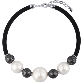 Изготовлено из ювелирного сплава на основе латуни с гальваническим покрытием родием. Изделие украшают белый жемчуг Майорка диаметром 30мм и черная лава диаметром 18мм. Длина черного каучукового шнурка 45см. Замок-карабин с удлинителем 5см.