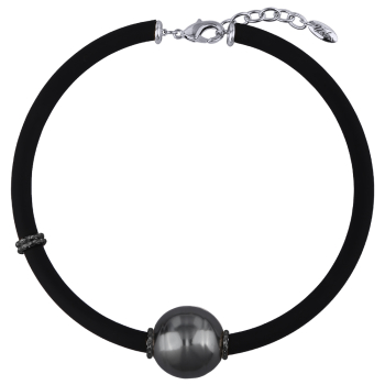 Изготовлено из ювелирного сплава на основе латуни с гальваническим покрытием родием и черным родием. Изделие украшает белый жемчуг Майорка диаметром 30мм. Длина черного каучукового шнурка 45см. Замок-карабин с удлинителем 5см.