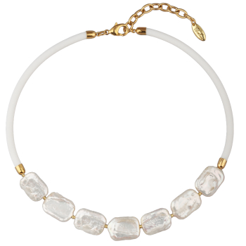 Изготовлено из ювелирного сплава на основе латуни с гальваническим покрытием золотом. Изделие украшают жемчуг белого цвета и белый каучуковый шнурок. Длина колье 40см. Замок-карабин с удлинителем 5см.