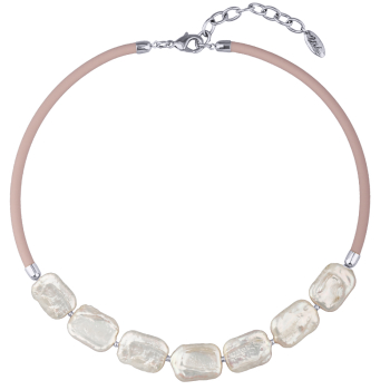 Изготовлено из ювелирного сплава на основе латуни с гальваническим покрытием родием. Изделие украшают жемчуг белого цвета и розовый каучуковый шнурок. Длина 40см. Замок-карабин с удлинителем 5см.