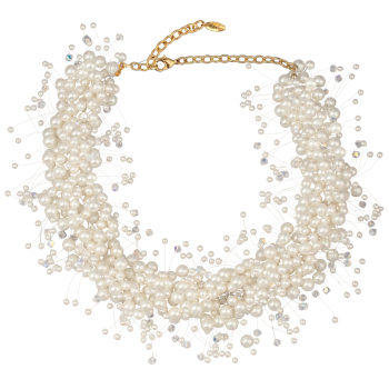 Изготовлено из ювелирного сплава на основе латуни с гальваническим покрытием золотом. Изделие украшают белые жемчуг Майорка диаметром 3-7мм и кристаллы SW размером 7х7мм. Длина 45см. Замок-карабин с удлинителем 7см.