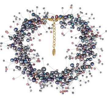 Изготовлено из ювелирного сплава на основе латуни с гальваническим покрытием золотом. Изделие украшают бензиновый жемчуг диаметром 3-7мм и кристаллы SW аметистового цвета размером 7х7мм. Длина 36см. Замок-карабин с удлинителем 5см. *Цвет и форма же