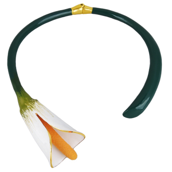 Изготовлено из ювелирного сплава на основе латуни с гальваническим покрытием золотом. Изделие украшает эмаль белого, зеленого и желтого цвета, нанесенная вручную. Установлен пружинный механизм отвода. Размер украшения 6х4см.