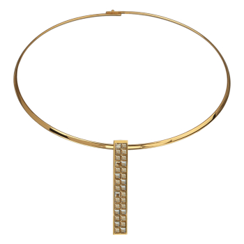 Изготовлено из ювелирного сплава на основе латуни с гальваническим покрытием золотом. Изделие украшают кристаллы SW цвета шампань. Длина колье 42см. Размер кулона 5, 3х0, 8см.