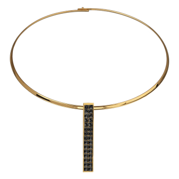 Изготовлено из ювелирного сплава на основе латуни с гальваническим покрытием золотом. Изделие украшают кристаллы SW темно-серого цвета. Длина колье 42см. Размер кулона 5.3х0, 8см.