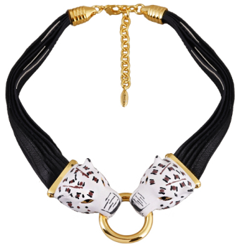 Изготовлено из ювелирного сплава на основе латуни с гальваническим покрытием золотом. Изделие украшают белая матовая эмаль и черные кристаллы SW. Длина черного кожаного шнурка 45см. Замок-карабин с удлинителем 9см.