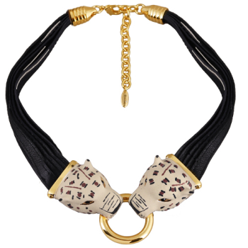 Изготовлено из ювелирного сплава на основе латуни с гальваническим покрытием золотом. Изделие украшают бежевая матовая эмаль и черные кристаллы SW. Длина черного кожаного шнурка 45см. Замок-карабин с удлинителем 9см.