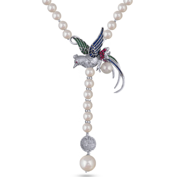Изготовлено из ювелирного сплава на основе латуни с гальваническим покрытием родием. Изделие украшают разноцветные фианит и жемчуг Майорка белого цвета диаметром 8-12см. Длина колье 75см. Размер украшения 6.5х4.3см.
