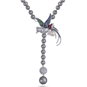 Изготовлено из ювелирного сплава на основе латуни с гальваническим покрытием родием. Изделие украшают разноцветные фианит и жемчуг Майорка темно-серого цвета диаметром 8-12см. Длина колье 75см. Размер украшения 6.5х4.3см.