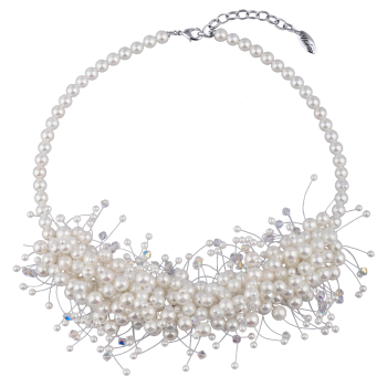 Изготовлено из ювелирного сплава на основе латуни с гальваническим покрытием родием. Изделие украшают белые жемчуг Майорка диаметром 6мм и кристаллы SW размером 7х7мм. Длина 40см. Замок-карабин с удлинителем 5см.